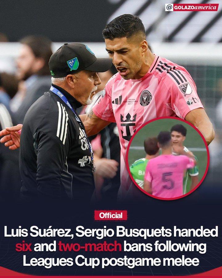 联盟杯纪律委员会决定,苏亚雷斯被禁赛6场,布斯克茨禁赛2场,只在联盟杯中执行。